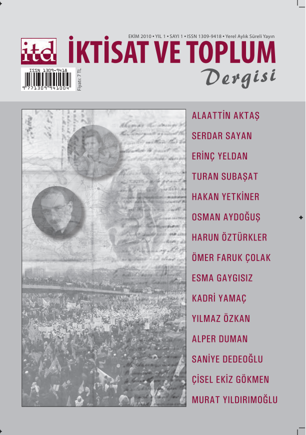 tutum izlemek oldu. Böylece, değişik sorunlara sadece baskın neoklasik teorinin kimi zaman çok dar açılı olabilen çerçevesinden bakma gereğinden kurtulabileceğimizi düşündük. Gerçekten de bu dar bakış açısının yaşadığımız kimi olayları, krizleri analiz etmemizi güçleştirdiği, hatta bazen çözüm üretmemizi geciktirip, engellediği kanısındayız. İktisada merak duyan herkesin, ayda bir defa yayınlayacağımız, bazı yazarlarımızın köşe sahibi olarak sürekli yazacağı dergimize okuyarak ve abone olarak destek vermesini bekliyoruz. Çünkü İKTİSAT ve TOPLUM DERGİSİ ancak bu şekilde yaşayabilir. Bu ilkeler ve dilekler çerçevesinde siz değerli dostlarımızdan gelecek her türlü katkıya açığız. Sizlerle birlikte büyüyecek olan dergimizin, iktisat alanına olduğa kadar bilim