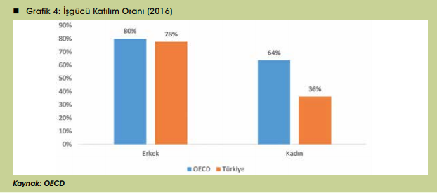 15-64 yaş arası işgücü içerisinde kadınların işgücüne katılma oranlarına baktığımızda, OECD ülkeleri arasında Türkiye’nin yerinin epey geride olduğu görülüyor. 2016 verilerine göre kadınların işgücüne katılımı için OECD ortalaması %63,6 iken, Türkiye’de bu oran %36,2 ile listenin en gerisindedir.