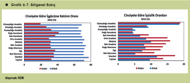 Elbette işgücü katılımı oranı, istihdam piyasası açısından konunun sadece bir yönü. Bölgesel farklılıklar da gözetildiğinde, Türkiye’de istihdamı çalışırken, cinsiyet boyutunun ötesine geçme ihtiyacı ortaya çıkıyor. İşgücü katılımını etkileyen sosyal-kültürel ya da coğrafi faktörlerin yanında genel anlamda ekonominin iş üretme yeteneğinin de ele alınması gerektiği, istihdam hakkı açısından bakıldığında kadın ve erkek için aynı anda iyileştirmeye ihtiyaç olduğu görülüyor.