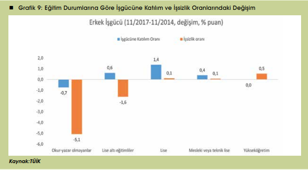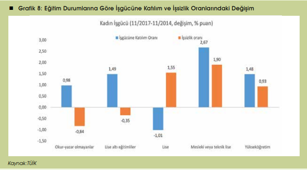 Nitekim yıllar içerisinde kadın ve erkeğin hem işgücüne katılım hem de işsizlik oranlarını, eğitim durumuna göre ayırıp baktığımızda, istihdam piyasasının genelini kapsayan yapısal bir eksiklik tespiti daha da belirginleşiyor. Kadının işgücüne katılımı, lise grubu hariç her eğitim grubunda artıyor. İşsizlik oranındaki artış ise özellikle lise ve üstü (mesleki ve teknik lise, yükseköğretim) eğitim grubunda belirginleşiyor. Erkek işgücü için bu duruma baktığımızda, işsizlik oranındaki artışın yine lise ve lise üstü grupta olduğu, okur-yazar olmayanlar ve lise altı eğitimde, işsizlik oranının gerilediği görülüyor. İstihdam piyasasının iş yaratma gücünün yüksek eğitim seviyesini yeterince destekleyememesi, eğitim politikası kadar sanayi politikasını da ilgilendiren bir durum. Dolayısıyla atılacak adımların da sanayi-eğitim gibi farklı alanları kapsayıcı perspektifte olması bir zorunluluk.