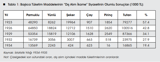 O yıllarda Mustafa Kemal Atatürk “Planlı Ekonomi” siyasetinin, kendine yeterli iktisadın, beş beyaz nesne ile sağlanacağını düşünüyordu: Un, Bez, Şeker, Kâğıt ve Çimento. Bu nesnelerin dış alımından ekonominin öncelikle kurtarılması gerekiyordu. Osmanlı’nın 1913-14 yıllarında toplam dışalımının %53.4’ünü bu beş beyaz nesne yutuyordu. Cumhuriyetin kuruluşunun 9’uncu yılında bu oran %31’e düşürüldü. Öyle anlaşılıyor ki, dışalımla sağlanan tüketim nesnelerinin yurt içinde üretilerek döviz tasarrufu sağlanması yani dış ticaretin açık vermemesi amaç alınmıştı. Aşağıdaki çizelge bunu kanıtlıyor:
